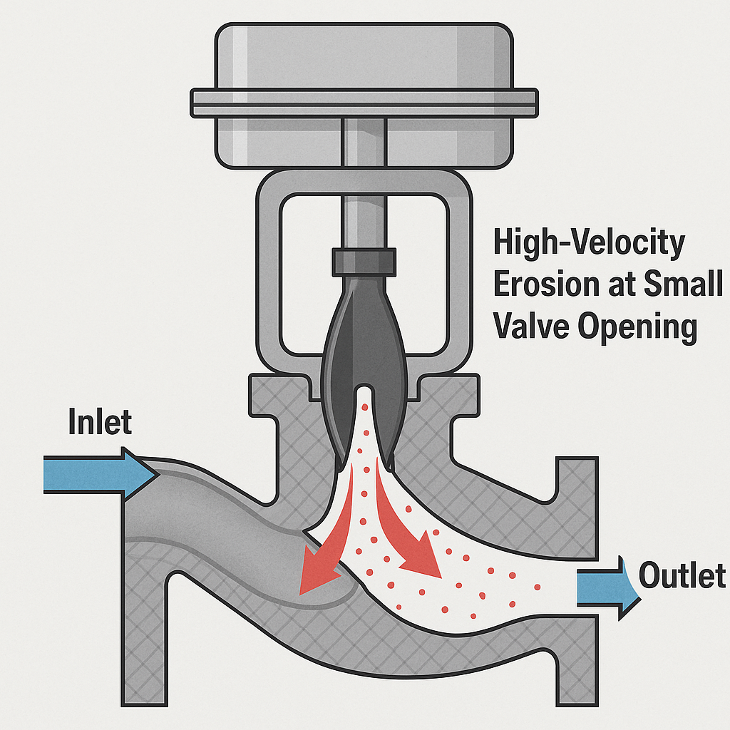 📌 Suggested Illustration: High-velocity erosion at small valve openings (cutaway view).